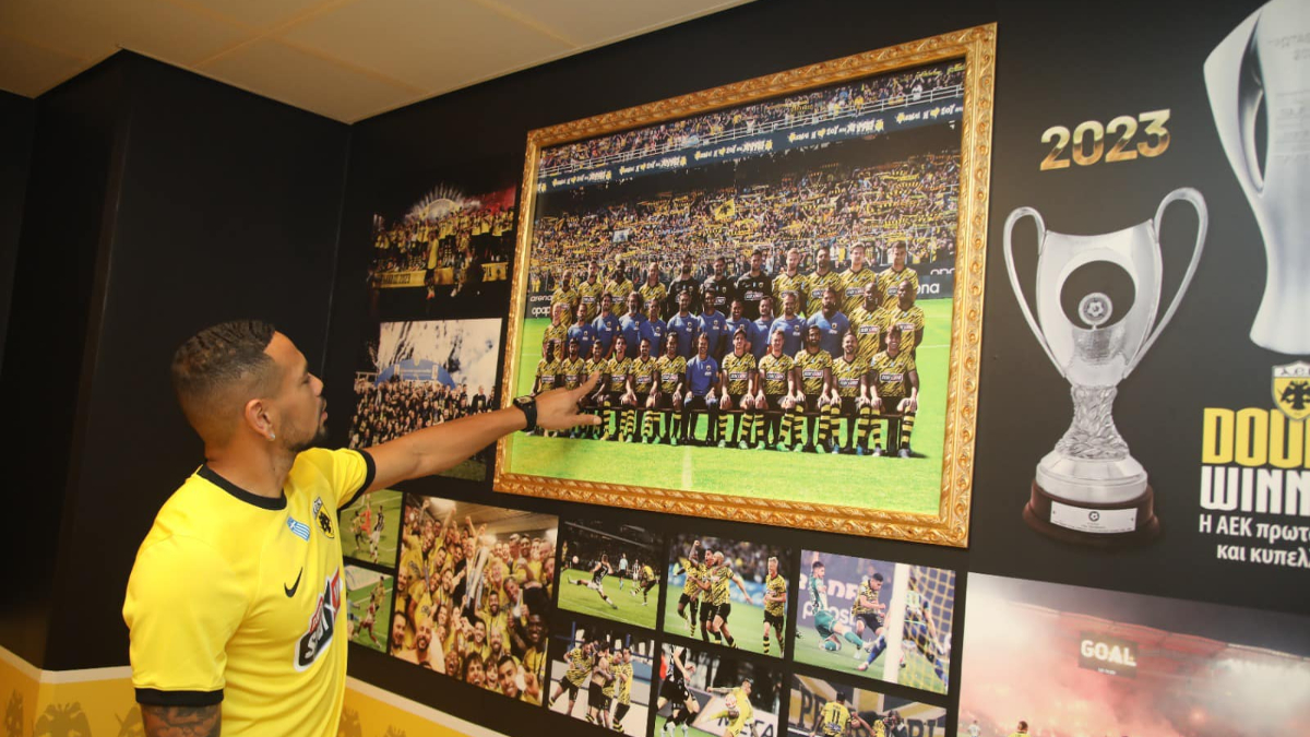 Παρέλαβε τη φανέλα με τον αριθμό «18», έβγαλε τις πρώτες του φωτογραφίες και ξεναγήθηκε σε όλους τους χώρους του γηπέδου της ΑΕΚ.